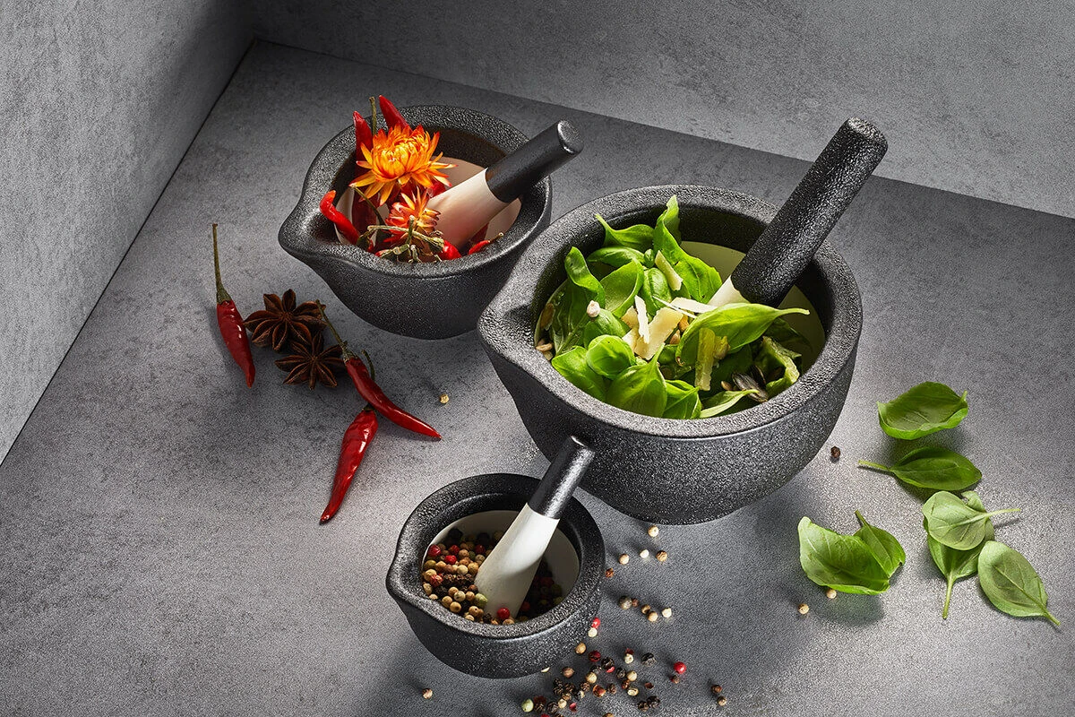 De Grino vijzels zijn allen voorzien van een handig schenktuit voor het gemakkelijk verwerken van kruidenpasta’s of pesto’s. De stamper in de Grino lijn heeft een wit eindje en ligt comfortabel in de hand. Met een vijzel bereidt u zelf eenvoudig de heerlijkste pesto’s, sambal, guacamole en boemboes.