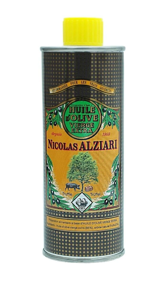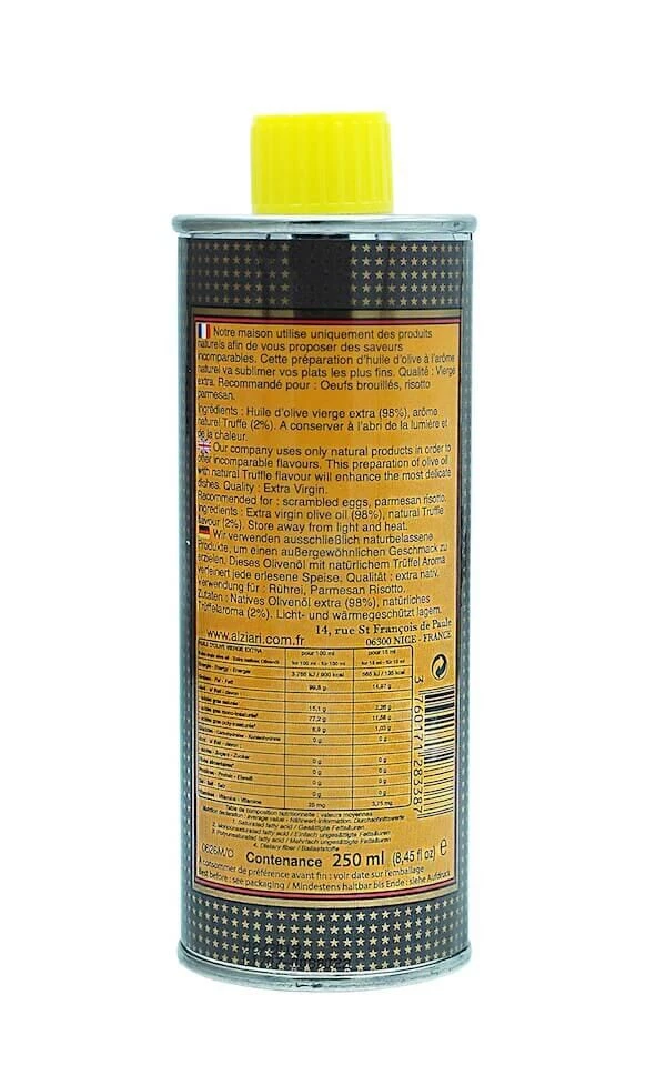 De Diamond Noir olijfolie van Nicolas Alziari heeft een krachtige smaak en wordt geleverd in een blik van 250 ml. De olie bestaat uit 98% olijfolie en 2% truffelaroma. De smaak combineert erg goed met roerei, risotto en Parmezaanse kaas.