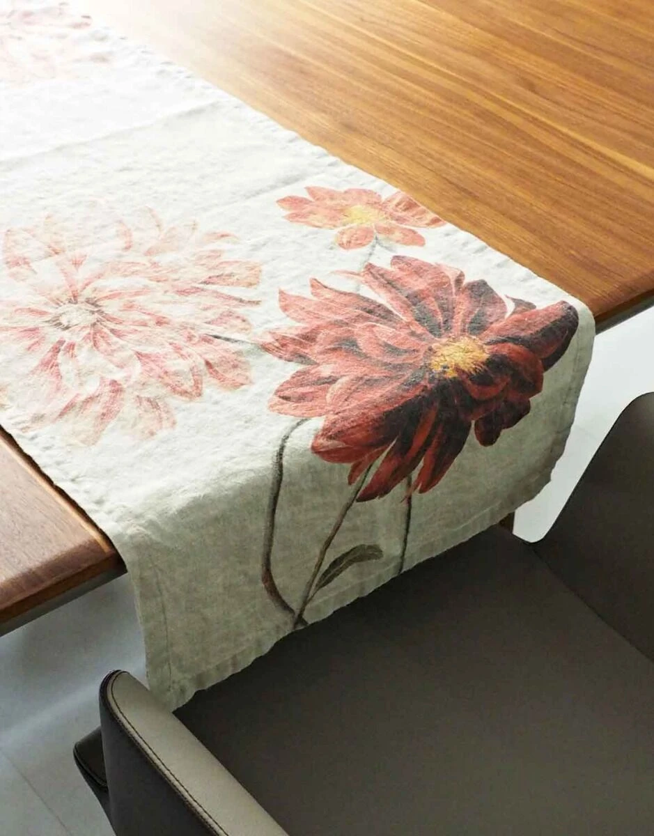 De Oldenhof Dahlia tafelloper is gemaakt van eco-vriendelijk linnen en is uitgevoerd in de kleur beige met rode dahlia’s. De tafelloper heeft een lengte van 136 cm en is 46 cm breed. Gebruik de tafelloper op tafel ter decoratie en als ondergrond voor tafelgerei en servies.