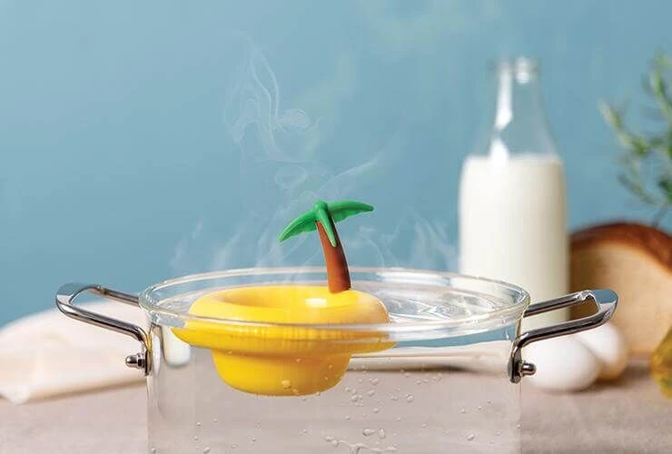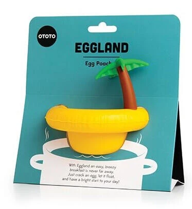 De Eggland eipocheerder van Ototo is gemaakt van geel silicone. De pocheerder is vormgegeven als een tropisch eiland en kan worden gebruikt om gemakkelijk eieren in een pan water te pocheren.